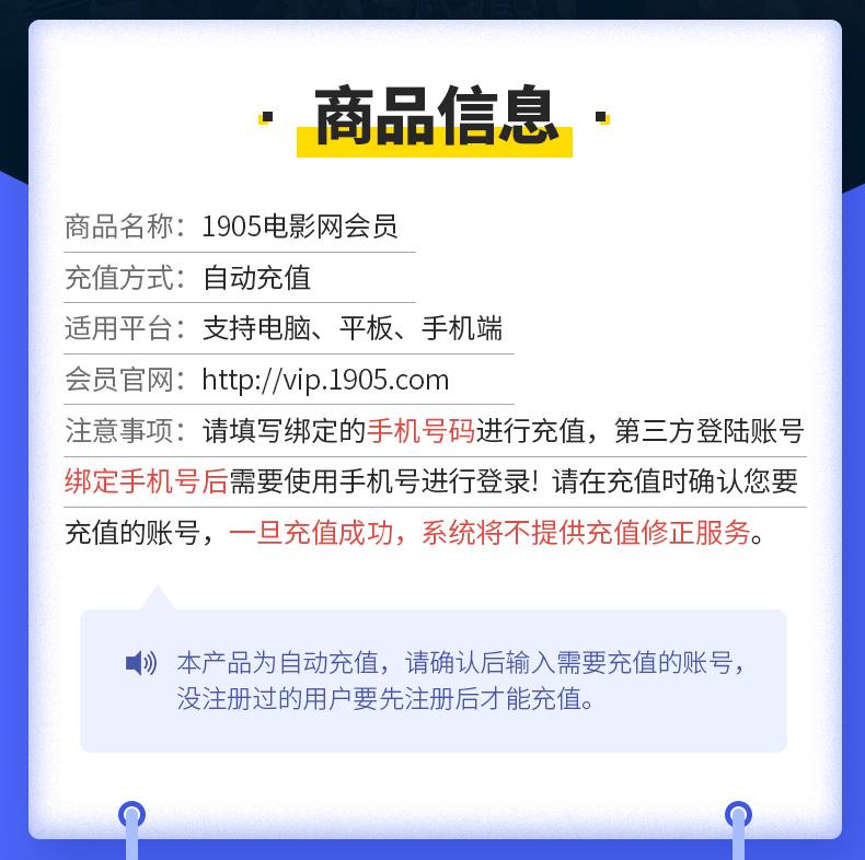 【自动充值】1905电影网电视会员12个月